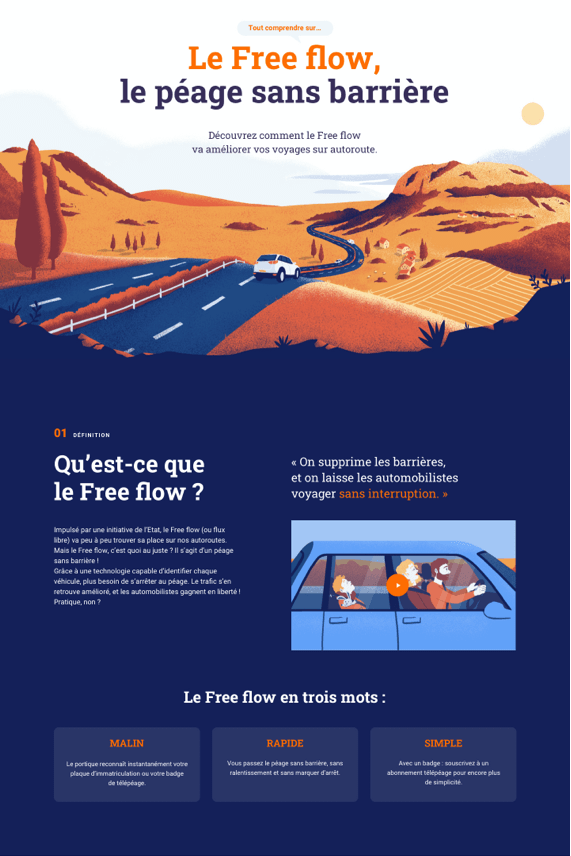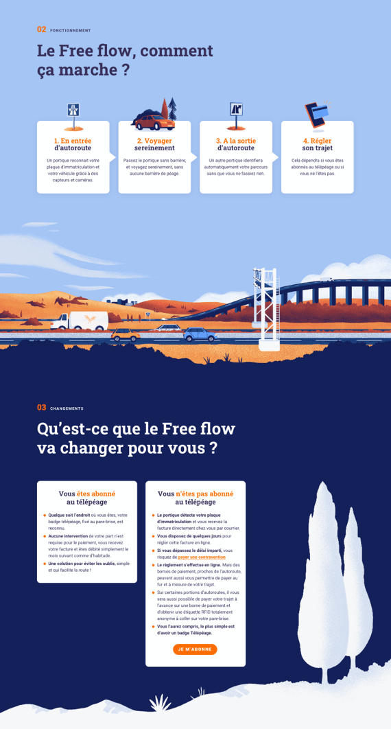 With the arrival of barrier-free tolls in France, or Free Flow, Ulys wishes to present this technology through an educational mini-site. Faced with the French very critical of the motorway concessionaires close to the brand, no missteps are allowed. In this delicate context, the adoption of this new product will only take place through fair communication that departs from the beaten track.