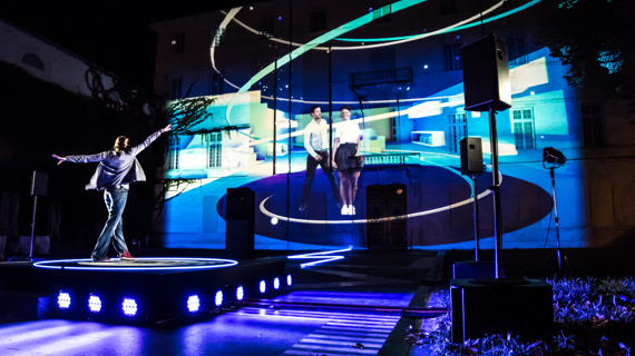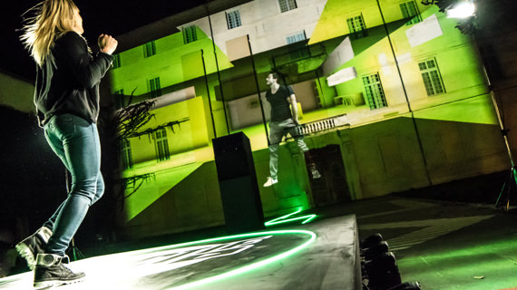 Nous avons donc conçu un show interactif mêlant mapping vidéo, captation kinect et spectacle son et lumière. La chorégraphie improvisée par les passants est alors captée par un détecteur de mouvement, et réinterprétée par des vidéos préenregistrées de danseurs pro projettée sur la facade du musée Fabre rendant le moment aussi jouissif que spectaculaire.