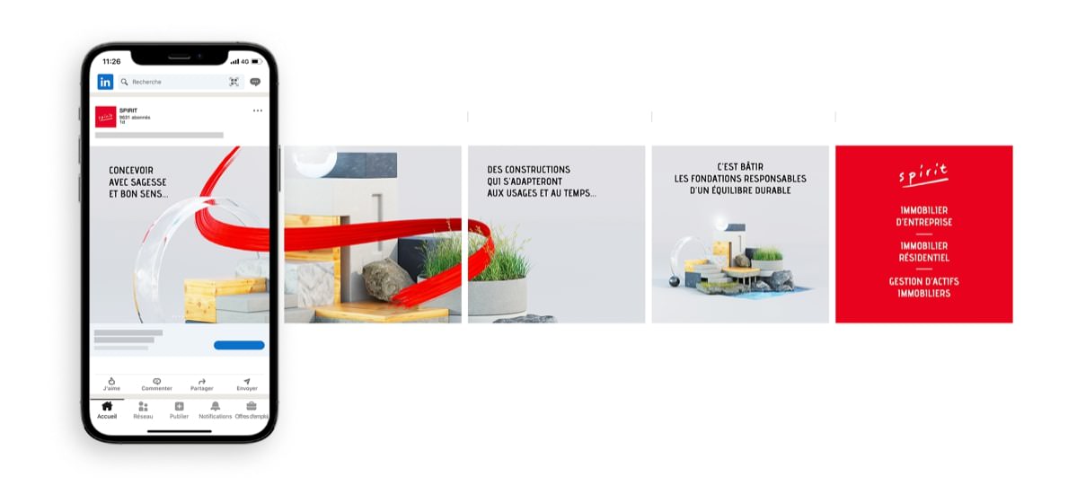 La réflexion de Spirit s’articule autour de 3 thématiques : écologie, mixité et croissance. C’est autour de ces piliers que Sweet Punk a bâti la stratégie digitale. Chaque territoire fait l’objet d’un écosystème sur LinkedIn avec boucle vidéo 3D, carrousel et visuel-clé. Le storytelling est renforcé avec une newsletter par thématique qui approfondi la co-construction avec des interviews et du contenu exclusif. Fer de lance de la campagne, un manifesto permet de partager la vision de la marque auprès des prospects. L’ensemble des réflexions sera partagé aux partenaires de Spirit à travers un ouvrage de 43 pages revenant sur les points clés de cette initiative, positionnant la marque comme un bâtisseur et un visionnaire.